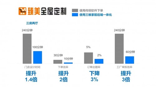 梅州市臻美装饰设计有限公司2021年3月合作三维家前后端设计生产一体化软件,设计一个全屋方案由240分钟减少至100分钟,设计效率提升1.4倍;下单效率提升2倍;订单出错率由5%下降至2%;审单拆单效率提升2倍;板材利用率提升5%;订单周期由7天降至5天。