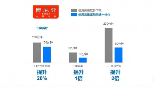 家居产业数字化转型成为大趋势,中小微企业也意识到技术带来的巨大作用。江门博尼亚定制工厂2020年1月开始使用三维家,拆单人员由原来的5人精简到3人,拆单效率提高了3倍,生产交货期减短了5-10天。