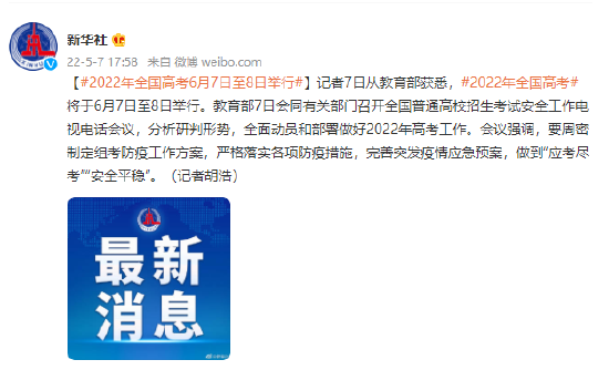 2022年全国高考将于6月7日—8日举行。为贯彻落实党中央、国务院关于做好今年高考工作的决策部署, 5月7日,教育部会同有关部门召开全国普通高校招生考试安全工作电视电话会议,分析研判形势,坚持稳字当头、稳中求进,全面动员和部署做好2022年高考工作。教育部党组书记、部长怀进鹏,中央网信办副主任、国家网信办副主任牛一兵,工业和信息化部党组成员、总工程师田玉龙,公安部党委委员、副部长陈思源等出席会议并讲话。