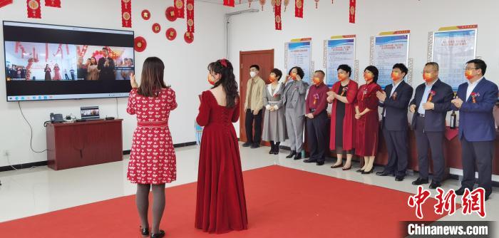 图为新人“隔空比心”,寓意交换信物。 徐巧明 摄现场,一对新人“隔空比心”,寓意交换信物;新娘黄碧瑶代表新郎向两位母亲献花、敬祝母亲节;当地艺术家赠送《花开富贵》和《福》字书画作品表达祝福。