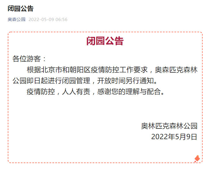 据奥森公园官微消息,根据北京市和朝阳区疫情防控工作要求,奥森匹克森林公园即日起进行闭园管理,开放时间另行通知。