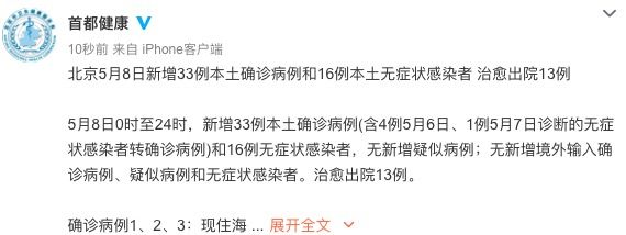 北京5月8日新增33例本土确诊病例和16例本土无症状感染者 治愈出院13例