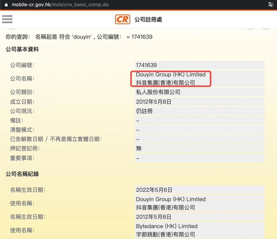 近日,香港公司注册处网站显示,字节跳动(香港)有限公司已更名为抖音集团(香港)有限公司。