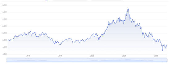 由中证指数有限公司编制的中概互联50指数囊括了国内主要互联网巨头,中证指数官网显示,截至5月5日,该指数点位为6335.30点,相当于2017年初水平,近一年跌幅高达50.78%,PE为17.22倍。而去年同期,该指数PE在50倍以上。