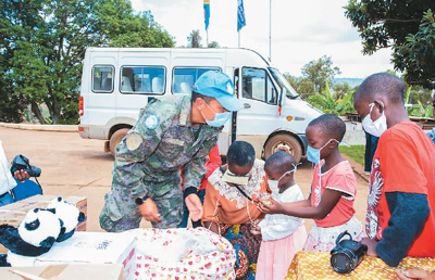 2021年6月1日,在刚果(金)东部城市布卡武的SOS儿童村,中国第24批赴刚果(金)维和医疗分队的队员把糖果分给孩子们。
