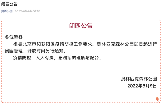 5月9日早上,北京朝阳公园、温榆河公园、奥林匹克森林公园、奥林匹克公园中心区、将府公园等宣布即日起闭园管理,开放时间另行通知。