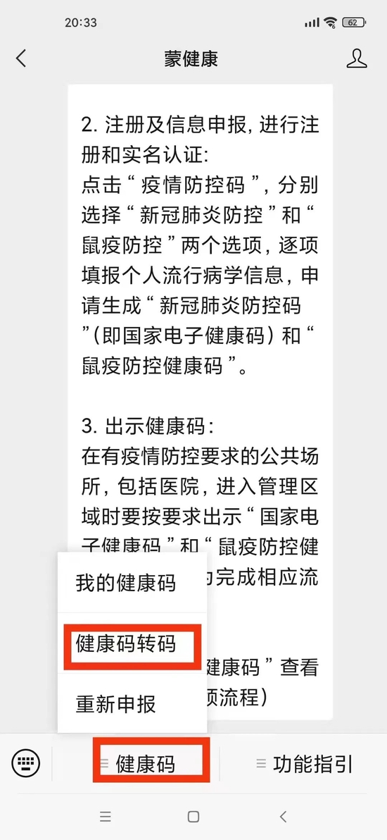 微信登录“蒙健康"微信公众号,点击屏幕左下角“健康码”,选择第二项“健康码转码”,点选”继续转码”,拍照上传佐证材料,提交,待疾控部门审核后转码。