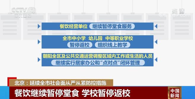 餐饮经营单位继续暂停堂食服务。全市中小学、幼儿园、中等职业学校暂停返校,组织线上教学。朝阳全区及公共交通运营调整区域内工作或生活的人员,继续实行居家办公和“点对点”闭环管理,中央和国家机关、央属企事业单位、大型总部企业原则上保持不高于50%的到岗率。
