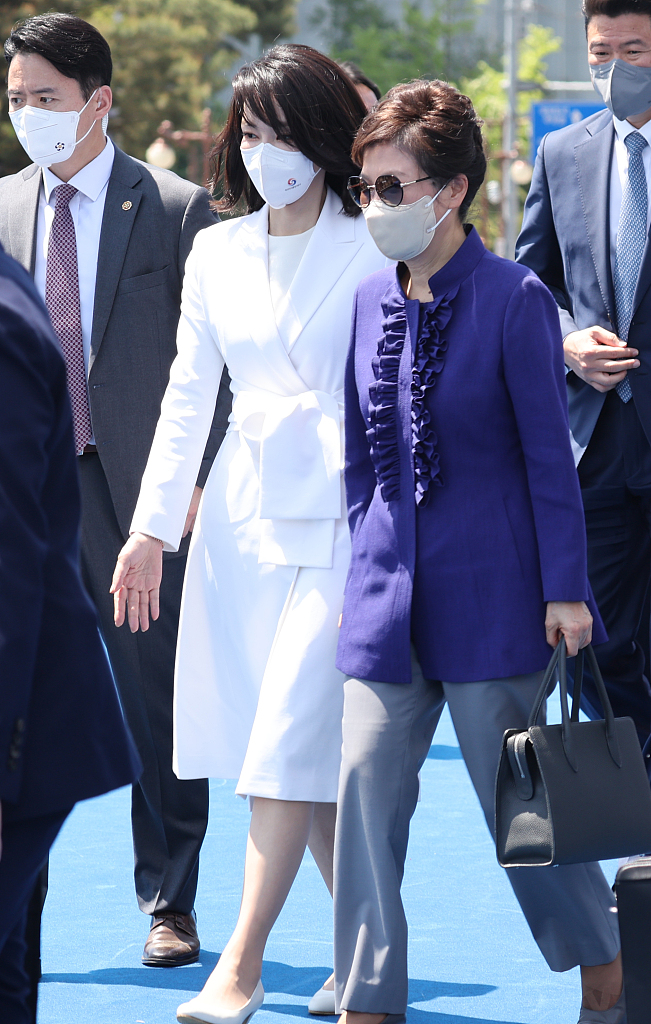 朴槿惠穿蓝色上衣现身,她笑容满面地与尹锡悦握手致意,并在尹锡悦的就职演说结束后随即鼓掌。还与韩国第一夫人金建希肩并肩走下典礼台,两人笑语不断。
