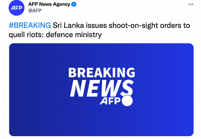 据法新社5月10日报道,斯里兰卡国防部发布“就地枪决令”以平息暴乱。