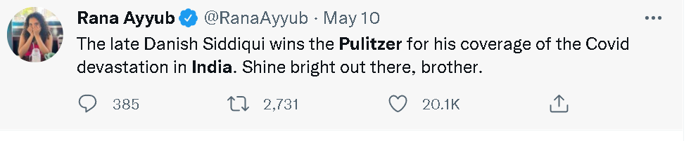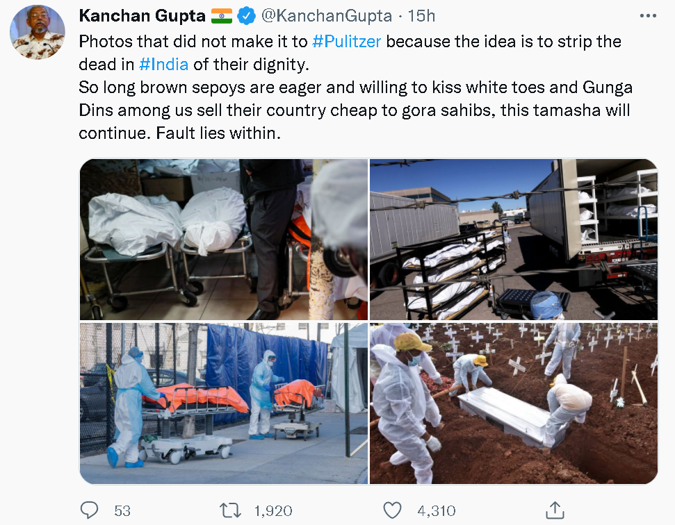 不仅如此,一些愤怒的印度网民——包括一些印度政府的职员,还纷纷贴出美国在新冠疫情中死人的照片,以示对“普利策”奖的抗议。有些帖文目前已经获得了数百乃至数千的点赞。