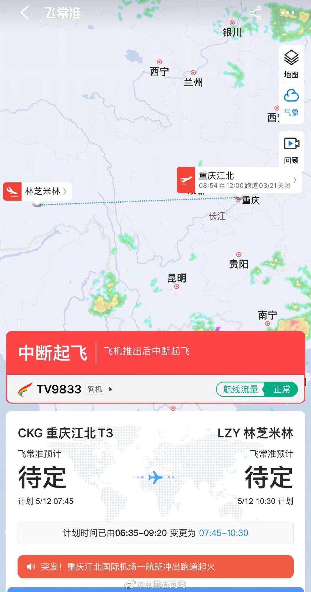 据央视新闻报道,12日上午,重庆江北国际机场一架重庆飞往拉萨的航班冲出跑道,导致飞机起火。飞常准APP显示,西藏航空TV9833(重庆-林芝)在飞机推出后中断起飞。