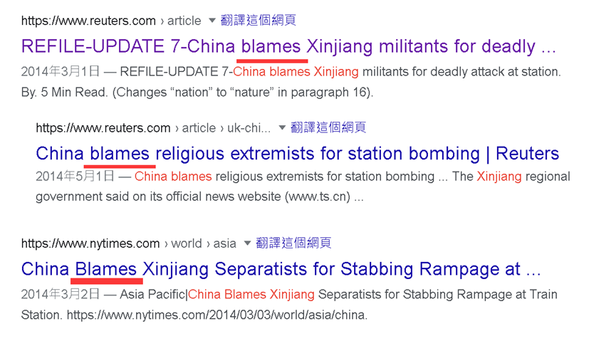 值得一提的是,这种表述此前曾被西方媒体广泛用于中国新疆发生的恐怖袭击报道上,比如2014年的昆明恐怖袭击事件发生后,路透社曾经打出“中国【责怪】‘恐怖分子’砍人”这样的标题——是的,他们当时还给那些实打实的恐怖分子打上了引号。