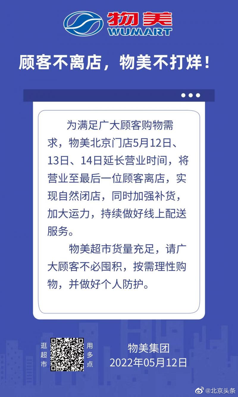 为满足广大顾客购物需求,物美北京门店5月12日、13日、14日延长营业时间,将营业至最后一位顾客离店,实现自然闭店,同时加强补货,加大运力,持续做好线上配送服务。