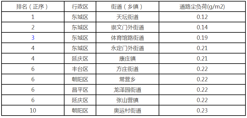 为有效控制道路扬尘污染,压实属地扬尘治理责任,北京市生态环境局委托第三方机构,2022年3月对本市平原地区273个街道(乡镇)合计1812条道路进行了道路尘负荷监测。结果表明,东城区天坛街道、东城区崇文门外街道、东城区体育馆路街道为全市平原地区道路尘负荷最低的三个街道(乡镇);房山区新镇街道、通州区张家湾镇、房山区良乡镇为全市平原地区道路尘负荷最高的三个街道(乡镇);房山区阎北路、昌平区百钟路、房山区黑鲁路为全市平原地区道路尘负荷最高的三条道路。