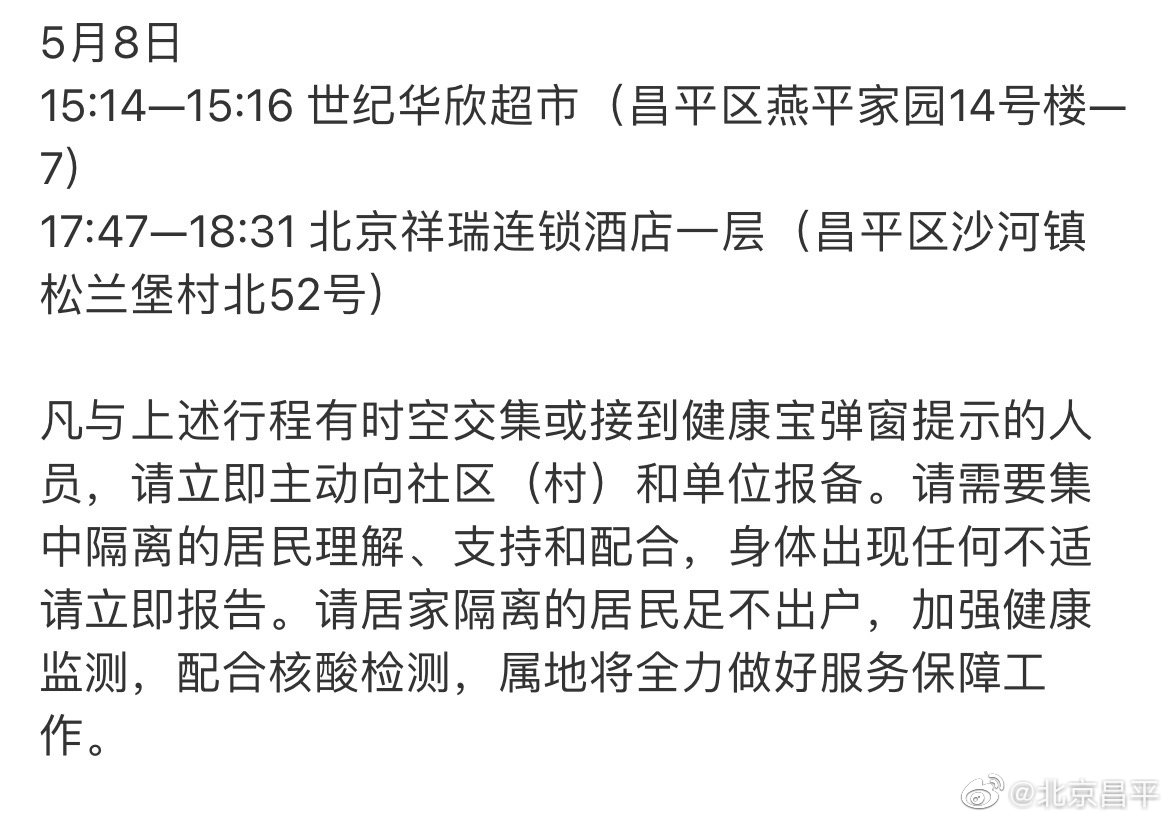 5月12日,外区新增1例核酸检测阳性人员,其轨迹涉及昌平区。昌平区已于第一时间启动应急处置,对相关人员涉及昌平区的风险点位落实管控措施,迅速开展流调溯源、排查管控、核酸检测等工作。现将轨迹通报如下!如有交集,请速报告!