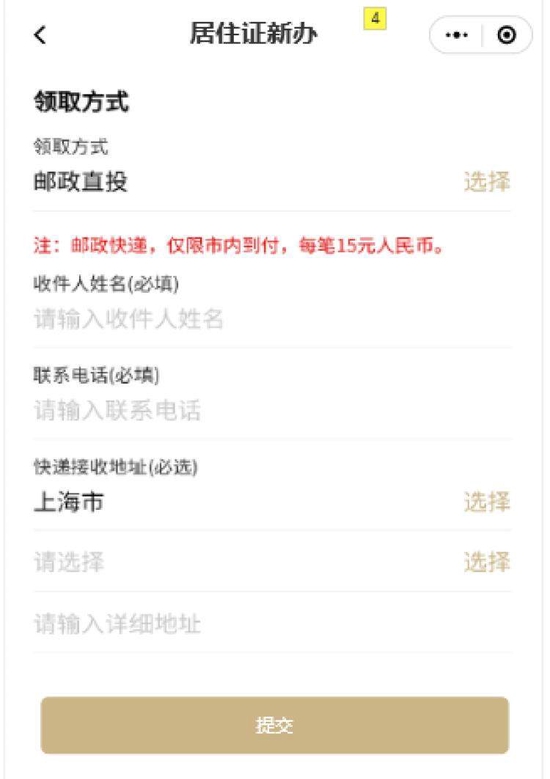 点击照面信息确认页“下一步”按钮,进入取件方式页。支持两种模式:网点自取和邮政直投。