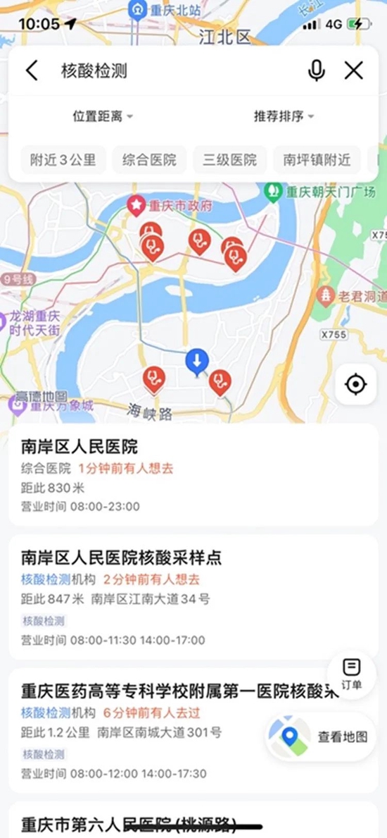 即日起,重庆市民打开高德地图APP,在首页搜索栏中搜索“核酸检测”,即可在地图上直观呈现附近的核酸检测采样点位,帮助市民快速了解周边核酸采样点位置,一键规划路线、导航前往所选点位。