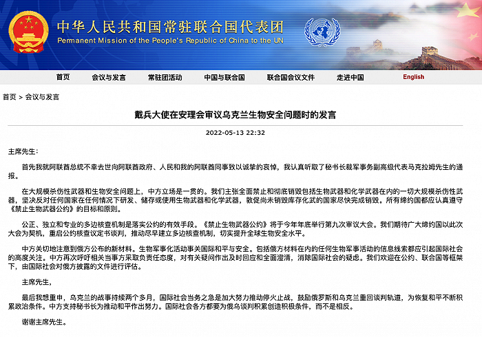 中国常驻联合国代表团网站5月13日发布戴兵大使在安理会审议乌克兰生物安全问题时的发言,全文如下。
