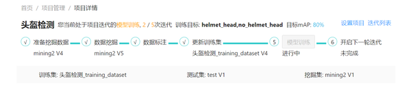 在以项目管理为理念的研发制式下,模型研发项目被切分为几个关键模块。每个模块对应一个任务,这些任务具备前后依赖关系形成研发流程。只有流程前方任务完成后,流程后方任务才能被启动。如下图所示,当一个模型研发项目被创建后,即能看到页面上方的任务迭代流程指引,清晰说明当前步骤与下一步骤,仅需按照指引点击鼠标操作即可,操作对小白用户十分友好、非常银杏化。