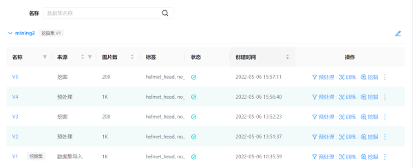 YMIR新增数据集版本管理功能,能自动生成数据集版本并记录每次对数据集的操作。一方面,与上一版本相比,使用者无需通过手动命名数据集对不同功能数据集进行区分,系统会自动进行数据整理,归入训练集、挖掘集、测试集等,并对这些数据集的更新进行版本控制。数据集和模型的一一对应关系亦被记录下来。此功能对有大量数据挖掘的模型研发十分友好,减少数据集版本的冗余,提高数据集管理效率。YMIR用户再也不用对着上百个雷同的数据集无从下手。另一方面,模型的研发过程被完整的记录下来,可轻易重新生产模型。传统的算法研发人员工作交接涉及,数据集、模型、训练流程等多个复杂环节的交接,很难重复之前的工作。而在YMIR平台上产生的研发过程,尤其是数据集的迭代均有完整追踪,基本不需要交接流程,企业再也不用担心员工突然的离职。