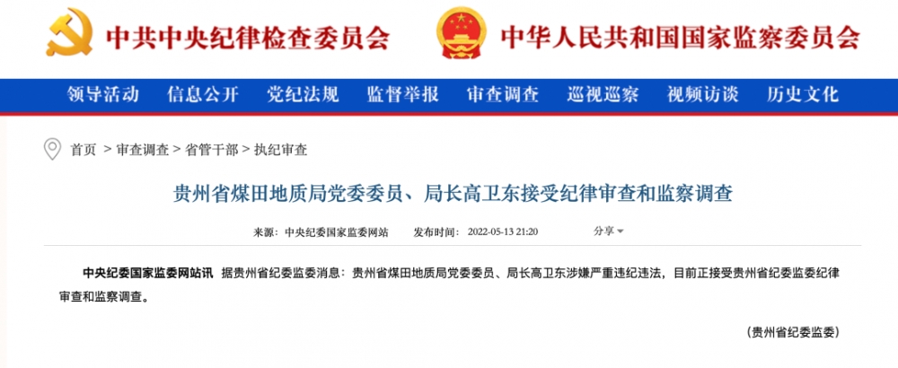 5月13日晚间,中央纪委国家监委网站发布消息称,据贵州省纪委监委消息:贵州省煤田地质局党委委员、局长高卫东涉嫌严重违纪违法,目前正接受贵州省纪委监委纪律审查和监察调查。