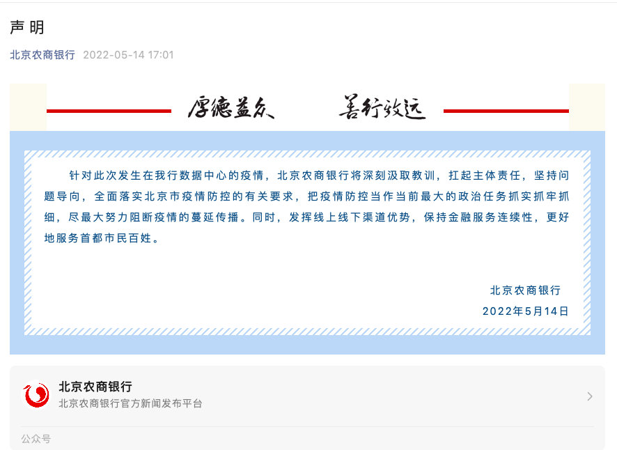 针对此次发生在我行数据中心的疫情,北京农商银行将深刻汲取教训,扛起主体责任,坚持问题导向,全面落实北京市疫情防控的有关要求,把疫情防控当作当前最大的政治任务抓实抓牢抓细,尽最大努力阻断疫情的蔓延传播。同时,发挥线上线下渠道优势,保持金融服务连续性,更好地服务首都市民百姓。