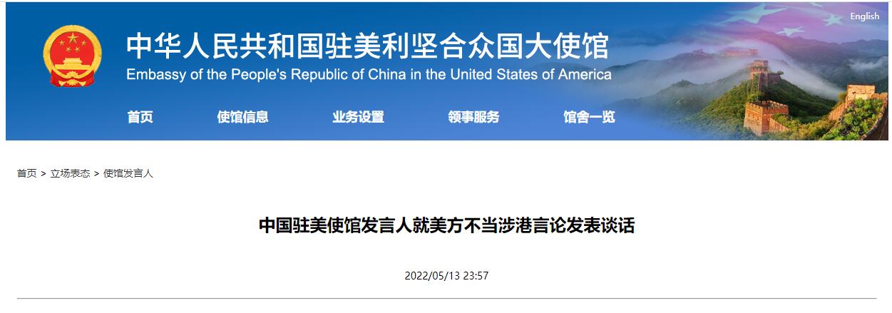 据中国驻美国大使馆消息,中国驻美使馆发言人就美方不当涉港言论发表谈话: