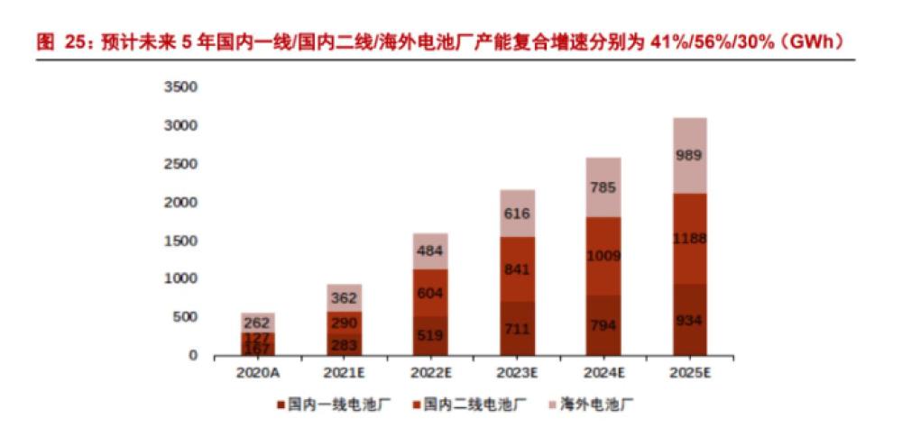 据浙商证券预测,2021年-2025年国内二线电池厂商的产能复合增长率高达56%,远高于国内一线电池厂商(41%)和海外电池厂商30%。