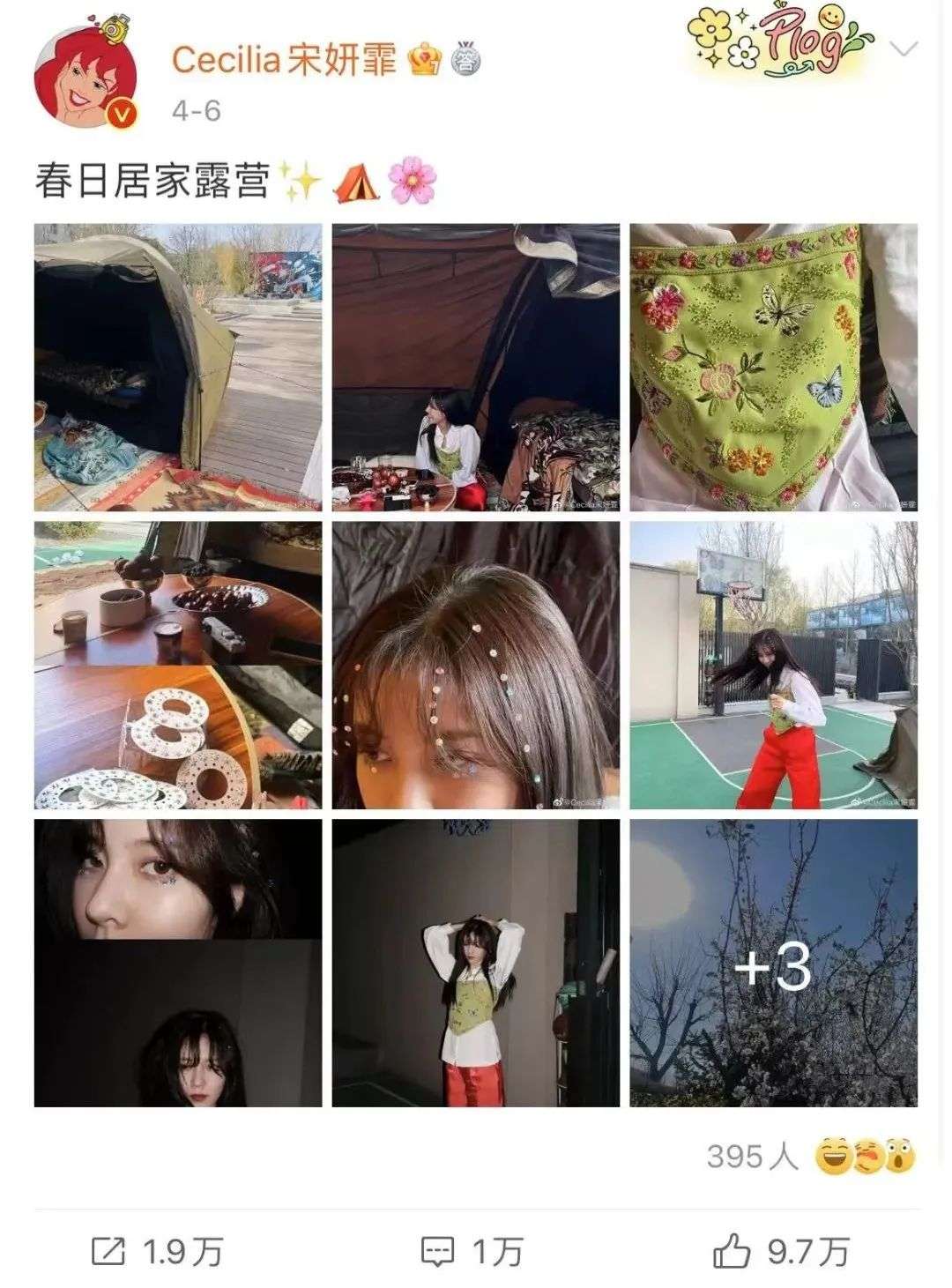 4月初,@Cecilia宋妍霏因一组“居家露营”的美照登上微博热搜。即使她并未真正出游,仅仅是在自家的院子里“云体验”了一下,但从照片中我们可以看到,诸如帐篷、小桌子、野餐垫之类的露营装备,准备得相当齐全,将“露营”的氛围感拉满。