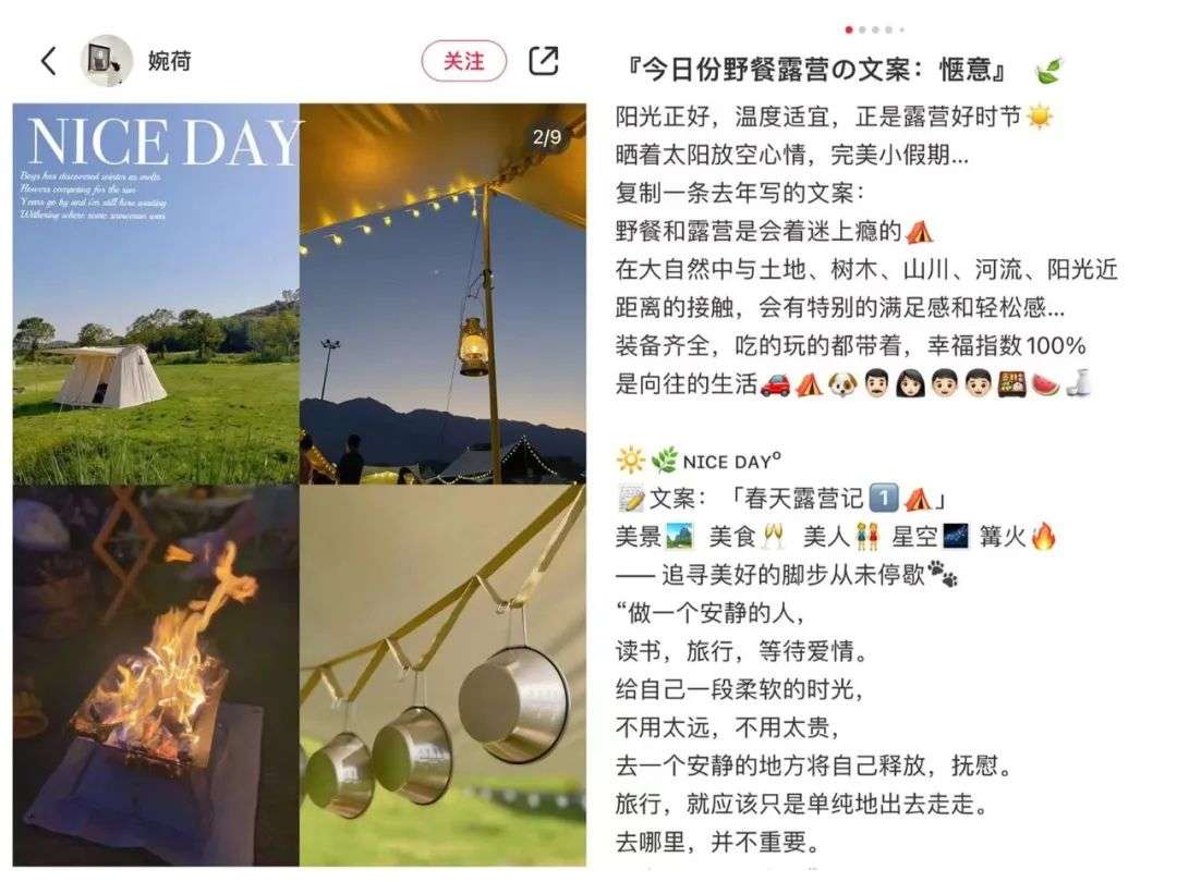 显然,这是很多非专业玩家们努力将自己的创作方向朝露营这一热点靠拢的成果。类似的“露营+”笔记还有很多,分析它们的走红原因,一方面是很多用户确实有这样的需求,另一方面在于这类型的笔记更贴合平台的主流内容,面向更多受众群体,传播速度和效果比起小众垂类赛道来说会更好。
