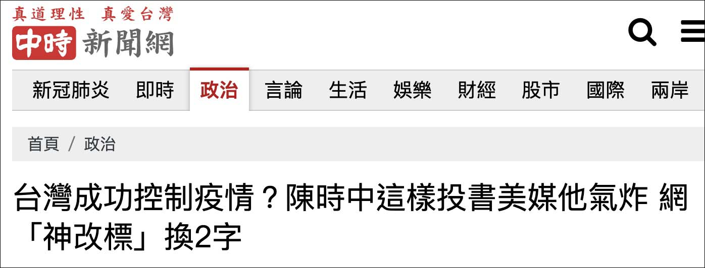 中时新闻网指出,本土确诊狂飙、疫情整备失控,陈时中却投书美媒,让全世界看好了“台湾如何成功抑制疫情”,这篇文章暴露两件事,其一,陈时中为了稳住自己的台北市长选情,已到了不得不睁眼说瞎话的窘境;其二,蔡政府所谓的“新台湾模式”已濒临失败边缘,落魄到得靠“出口转内销”的大内宣勉强支撑。