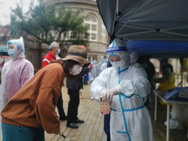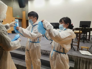 上海沪剧院院址为汾阳路150号,位于上海市徐汇区天平街道的衡复风貌区,这个区域有着极具上海特色的老弄堂、老建筑,但个别小区没有适合做核酸检测的公共空间。曾两次作为街道疫苗接种点的上海沪剧院积极对接天平街道,为属地居民提供核酸检测场所。在得知剧院院址的核酸检测点需要志愿者的消息后,剧院群里被“可以马上到岗!”的消息刷屏。志愿者团队在不到一天内集结完成,他们中有临近退休的老职工,也有乐于奉献的青年演员,大家换上了“大白”“小蓝”服装,协助工作人员做好物料准备、检测扫码工作。青年演员还发挥特长,用沪语播报检测流程,为居民耐心解答核酸登记问题。钱莹表示,“战‘疫’是一面镜子,照见了寻常日子里不易看到的忠诚和担当。在防疫一线学习到更多知识、收获更多经验、感受更多冷暖,更加体会到防疫一线工作人员们的艰辛和不易。坚持就是胜利,让我们肩并肩在爱中同行,重逢于抗疫之战取得胜利的上海!”党员带头“艺”起前行 共渡抗疫难关 清晨六点居委会报道、280户人家逐一上门通知、一上午鲜有歇脚的机会……这是上海沪剧院演奏团党支部书记洪立勇、上海沪剧院副院长姚慧在核酸检测日的工作日常。自四月初以来,洪立勇的志愿者生涯已经一月有余。在核酸检测现场,他不仅要提醒居民们排队时保持好秩序,还要在采样结束后传递整个小区的样本。近1500份样本,洪立勇要分好几次拿,东西虽然不沉,但他都格外小心。姚慧也是小区中的第一批志愿者,一开始志愿者只有寥寥十余位,现在则有近200位。