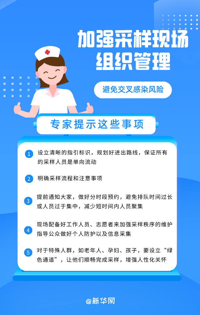 采样现场大家排队做核酸,如何避免交叉感染风险?郭燕红对于加强采样现场组织管理方面,给出以下提示: