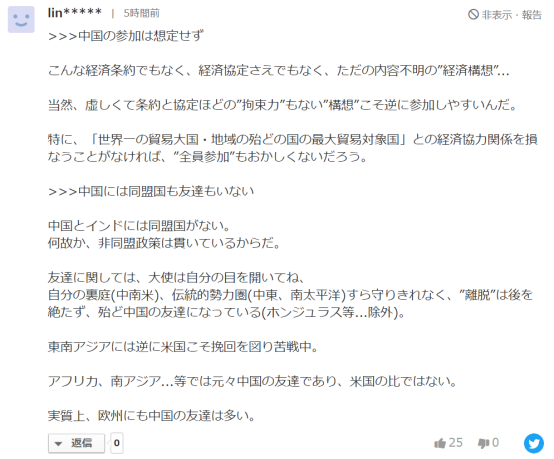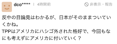还有人说道,“希望美国先回归TPP(即全面与进步跨太平洋伙伴关系协定,日本现沿用TPP缩写)。TPP本来是由美国提出,但自己却退出了该协定。在建新的经济圈前,希望先回归并发展TPP。”此外,这名网民还质疑,“这回的经济框架对美国来说太符合其自身利益了,到底有多少国家真心想要参加?对此感到疑问。”