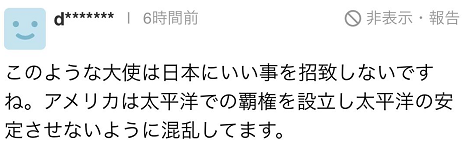 伊曼纽尔的这一系列涉华负面言论,在日本网络上遭到质疑和批评。有人直言,“像这种大使不会给日本带来好事。美国在太平洋树立霸权,搅乱太平洋地区,让这个地区不得安宁。”