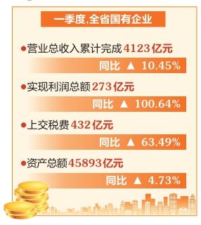 利润同比增长。一季度,全省国有企业实现利润总额273亿元,同比增长100.64%。分级次看:省级企业实现利润总额229亿元,同比增长74.9%;市县企业实现利润总额44亿元,去年同期仅实现4.8亿元。