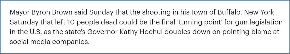 《每日邮报》15日报道说,纽约市长布朗(Byron Brown)表示,14日在布法罗发生的枪击事件或成为美国枪支立法的最后一个“转折点”。