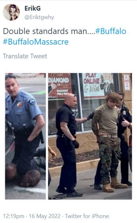 一位国外网友更是将非洲裔美国人弗洛伊德被警察当街“跪压”致死的照片(左图)与此次警方逮捕白人枪手的照片(右图)发布在社交媒体上,并评论说“双重标准”。