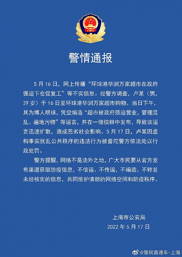 据@警民直通车-上海微博消息,上海市公安局5月17日发布警情通报称,5月16日,网上传播“环球港华润万家超市在政府强迫下仓促复工”等不实信息。经警方调查,卢某(男,39岁)于16日至环球港华润万家超市购物。当日下午,其为博人眼球,凭空编造“超市被政府强迫营业,管理混乱、遍地污物”等谣言,并在一微信群中发布,导致该谣言迅速扩散,造成恶劣社会影响。5月17日,卢某因虚构事实扰乱公共秩序的违法行为被普陀警方依法处以行政处罚。