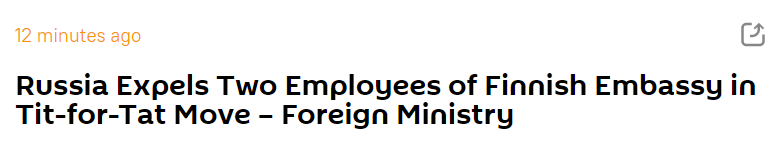 【环球网报道】俄罗斯卫星通讯社刚刚援引俄外交部消息,为回应俄外交官遭到驱逐,俄方决定驱逐两名芬兰驻俄罗斯使馆人员。