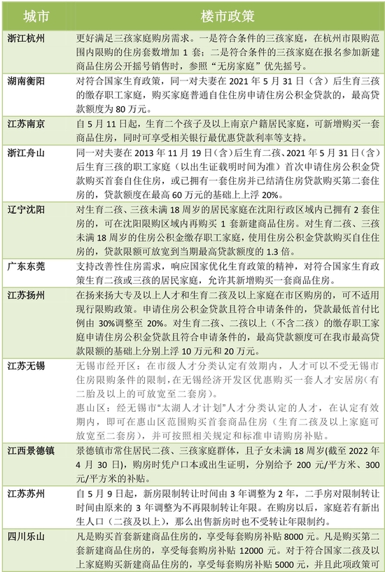 出台类似政策的还有东莞和沈阳。东莞于5月14日发布的《关于促进房地产市场平稳健康发展的通知》中提到,支持改善性住房需求,响应国家优化生育政策的精神,对符合国家生育政策生育二孩或三孩的居民家庭,允许其新增购买一套商品住房。