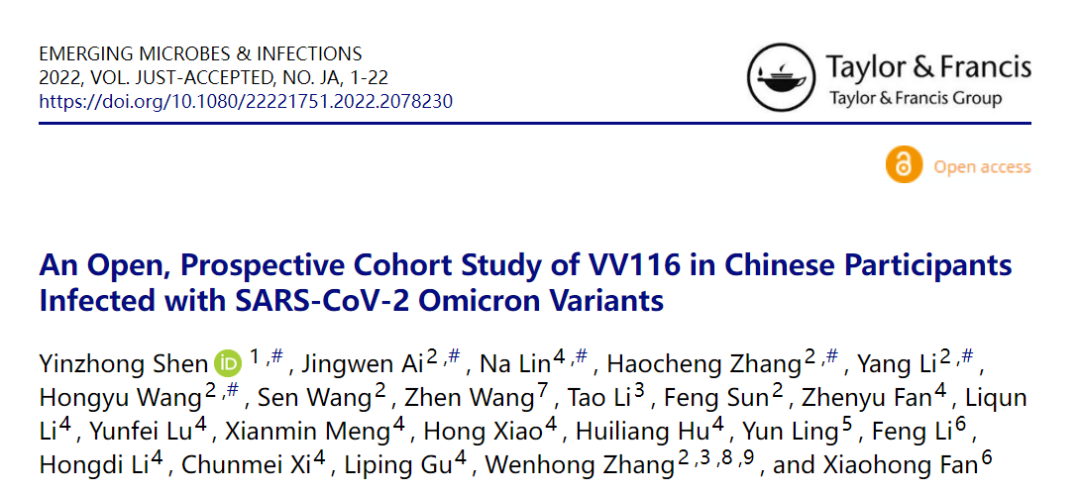 近期,国家传染病医学中心、上海市传染病与生物安全应急响应重点实验室、华山感染张文宏教授团队与上海公共卫生临床中心范小红教授团队、临港实验室共同合作,完成了一项开放性、前瞻性队列研究,评估VV116对非重症奥密克戎感染患者核酸转阴时间的影响,相关成果于5月18日发表在Emerging Microbes & Infections杂志。