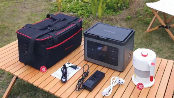 以我们这个功率600W、容量0.6L的电水壶为例。煮开一壶大概消耗15%的电量,羽博这个户外电源可以煮6~7壶,也就是4L差不多8瓶矿泉水左右,一下午赏景品茶也足够了。