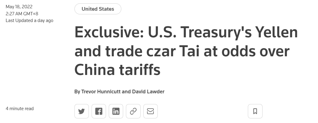 在通胀压力之下,近期美国把目光转移向取消对华关税问题。5月18日,美国财政部长耶伦表示,她主张取消部分对华惩罚性关税。耶伦表示,特朗普时代的对华关税如今没有什么战略意义,反而对美国消费者和企业的利益造成了损害。不过据路透社援引消息人士的说法,美国贸易代表戴琦更倾向于保留加征关税,以制定更具战略性的对华贸易计划,保护美国就业和市场。