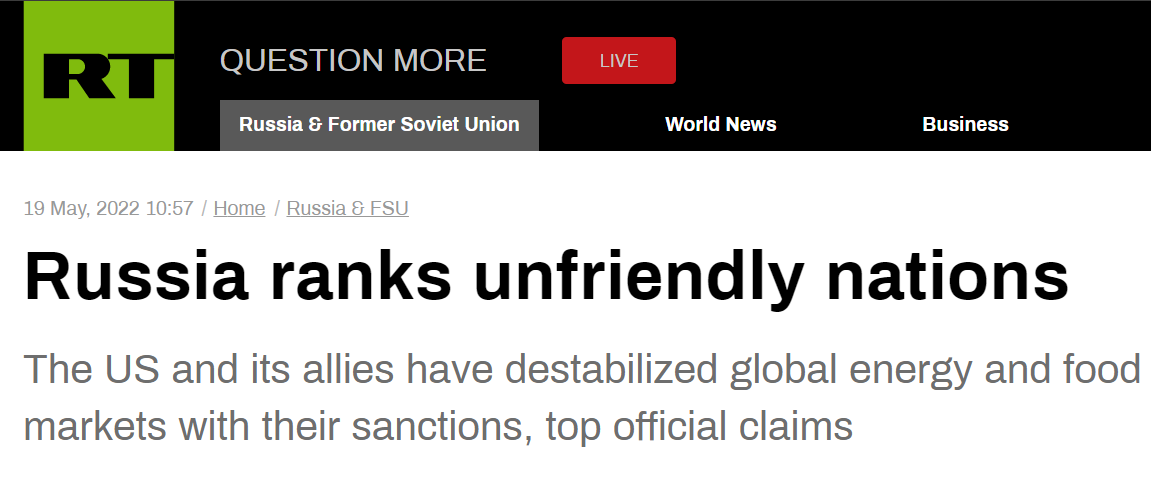 RT称,沃洛金在公布这份对俄“不友好国家”名单时批评说:“他们应该为全球性的物价飞涨而受到指责。”根据其统计,对俄罗斯实施了1983项不同制裁的美国排在了名单榜首,紧随其后的是加拿大、瑞士、英国、欧盟(作为一个单独的实体)、澳大利亚和日本。“通过对俄罗斯实施非法制裁,这些国家引发了能源和食品价格的飙升,” 这位俄官员表示,“这些(国家)是全球目前问题和未来危机背后的罪魁祸首。”