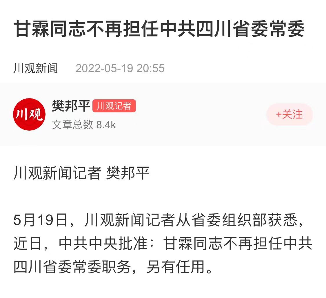 本文标题: 甘霖不再担任中共四川省委常委职务,另有任用