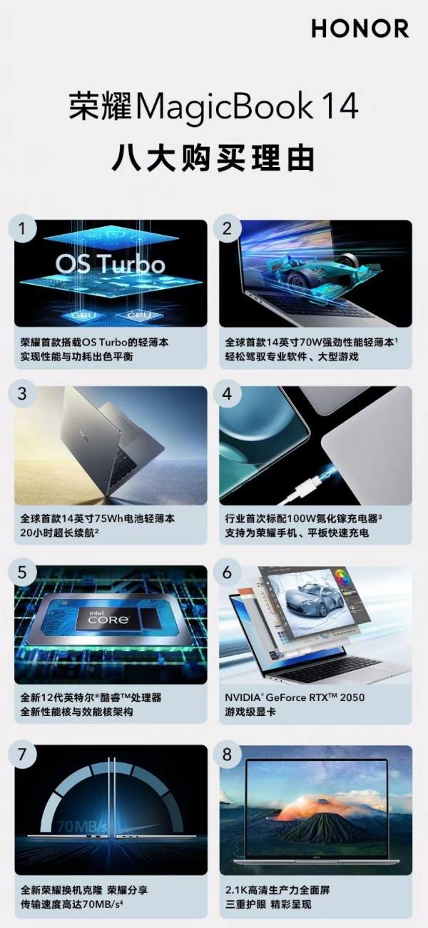 全新荣耀MagicBook 14正式开售!这是荣耀首款搭载OS Turbo的轻薄本,70W满血性能,20小时超长续航,性能时刻在线。全系搭载第12代智能英特尔®酷睿™ 标压处理器,最高搭载NVDIA® GeForce RTXTM 2050光追独显,是全球首款14英寸70W强劲性能轻薄本,也是全球首款14英寸搭载75Wh超大容量电池的轻薄本。全新荣耀MagicBook 14 售价5499元起,首销优惠价4999元起,荣耀商城、各大授权电商、荣耀体验店、授权零售门店现已开售。