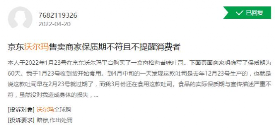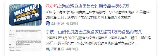 2022年4月,沃尔玛华东百货有限公司上海施湾分店因售卖过期食品被罚6.7万;