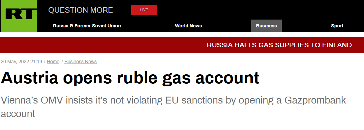 【环球网报道 记者 赵建东】在芬兰拒绝使用卢布结算,“被断气”之后,当地时间20日,奥地利石油和天然气集团OMV表示,该公司已在俄罗斯天然气工业银行(Gazprombank)开通卢布结算账户,并称此举并未违反欧盟目前对俄的制裁。